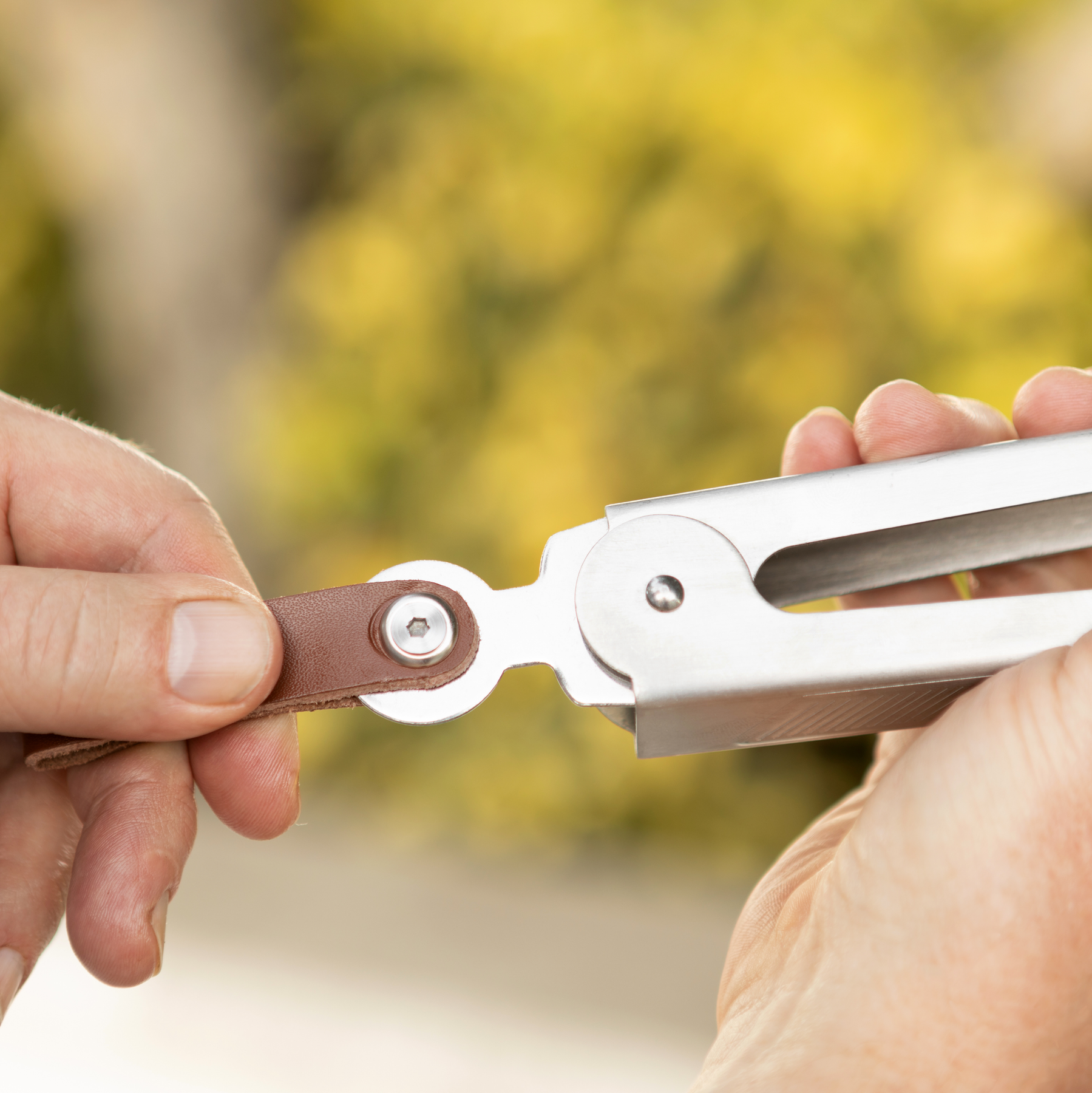 When not in use, hang the tongs up with the brown leather hang strap for convenient storage.