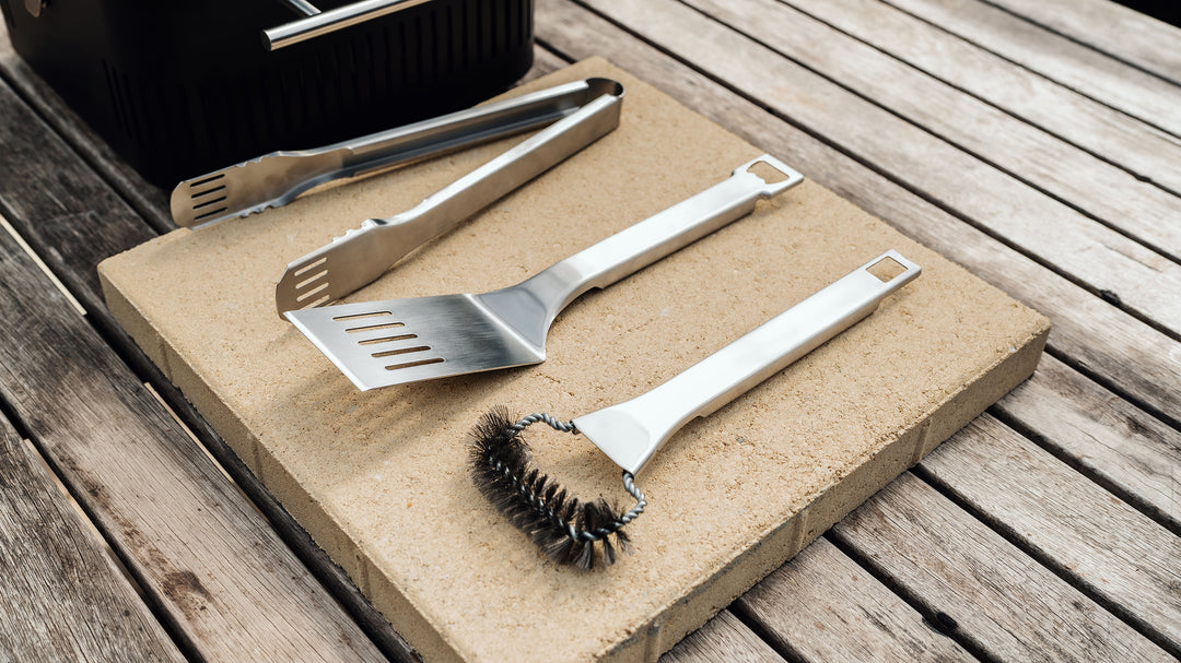 • Three-piece 430 stainless steel tool kit included - tongs, spatula, and cleaning brush